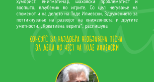 Здружението за поттикнување на развојот на книжевноста и други уметности, „Креативна верига” –Охрид, го распиша конкурсот за наградата „Тоде” за најдобра песна за деца. Право на учество на конкурсот имаат сите домашни автори кои заклучно со 30.12.2026 година ќе испратат своја необјавена песна на електронската пошта nagradatode@gmail.com . Изборот на трите песни кои …