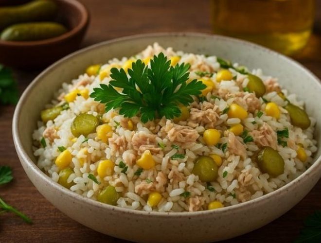 Изладете го сварениот ориз и ставете го во голем сад. Додадете исцедена туна, пченка и ситно исечкани кисели краставички. Додадете сечкан магдонос или копар. Додадете го мајонезот и нежно измешајте за да се соедини сè рамномерно. Зачинете по вкус со сол и бибер. Оставете ја салатата во фрижидер најмалку 20-30 минути – ќе биде уште повкусна како што ќе се спојат вкусовите.