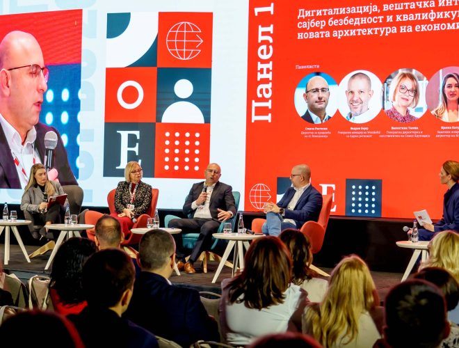 Првиот панел беше посветен на дигитализацијата, вештачката интелигенција, сајбер безбедноста и човечкиот капитал, отворајќи ја дебатата за тоа како технологијата веќе ја редефинира економијата и начинот на кој работат компаниите. Во дискусијата учествуваа Стевчо Ристески, директор за продажба на A1 Телеком, Бјанка Катру, заменик-извршен директор на М Кеш, Валентина Тасева, генерален директор и сопственичка на Семос Едукација, и Ведран Бајер, менаџер на Wonderful за Адриа регионот. Панелистите понудија различни, но комплементарни перспективи за иднината на бизнисот во дигиталната ера, како и за трансформацијата на пазарот на труд во услови на нови вештини и работни позиции креирани од вештачката интелигенција.